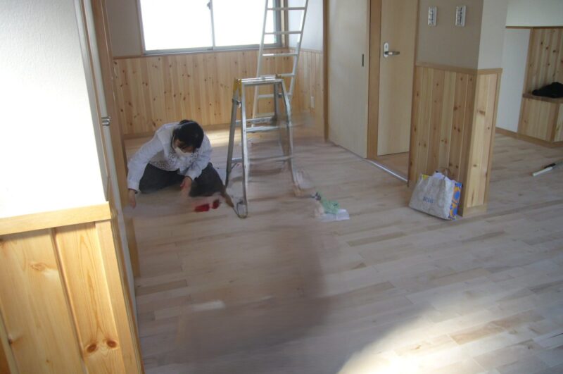 上棟式から早半年が経過し、徐々に内装が整い始めると、次は蜜蝋ワックスがけという大仕事が待っていました。